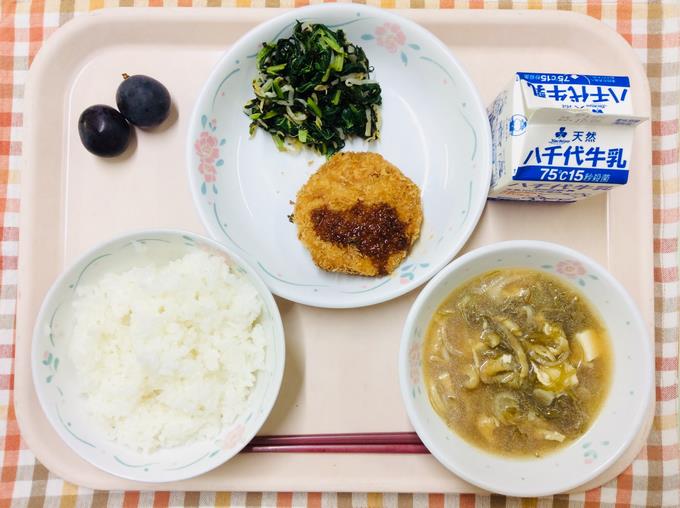 ご飯、おからコロッケ、磯香和え、めかぶのみそ汁、ぶどう