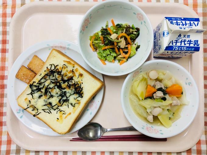 海苔チーズトースト、パン耳シュガー揚げパン、ツナサラダ、キャベツのポトフ