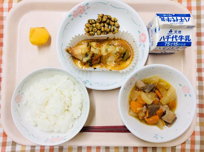 ご飯、鮭のチーズチャンチャン焼き、のり塩ビーンズ、大根のべっこう煮、柿