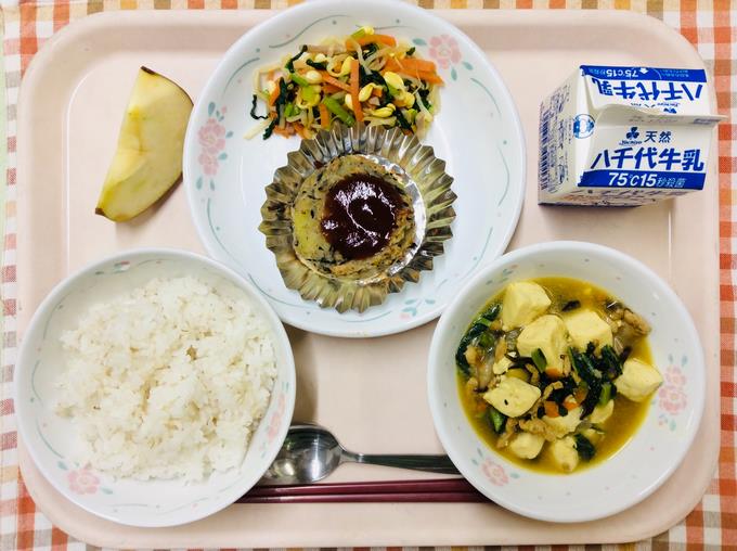 麦ご飯、ポテトのどら焼き、もやしのナムル、豆腐のカレー煮、りんご