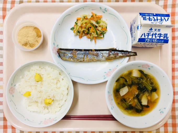 栗ご飯、秋刀魚の甘露煮、白菜の甘酢和え、里芋のみそ汁、きなこ白玉