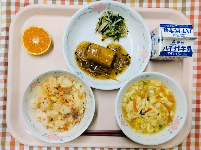 キムたくご飯、生揚げのきのこソースかけ、ビーフンとハムのサラダ、コーン卵スープ、みかん