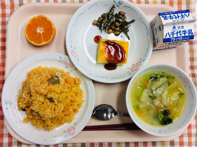 キャロットライス、オムレツ、のり塩いりこビーンズ、ABCスープ、みかん