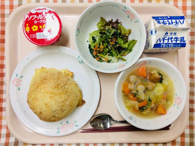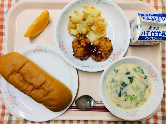 さつま芋パン、豆腐のナゲット、ベーコンポテトソテー、豆乳コーンスープ、オレンジ