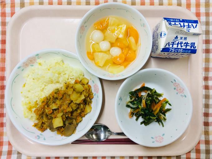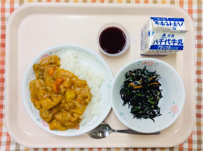 チキンカレーライス、ひじきのマリネサラダ、ぶどうゼリー