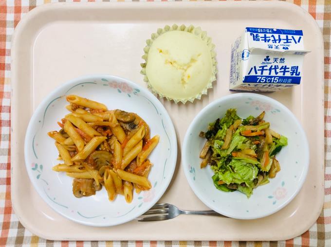 トマトソースのペンネ、オレンジ蒸しパン、ポテトのフライドサラダ