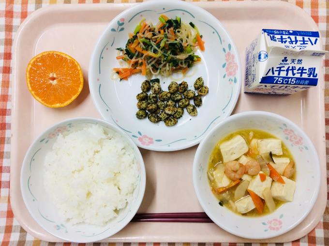 ご飯、えびと豆腐の中華煮、春雨サラダ、ポップビーンズ、みかん