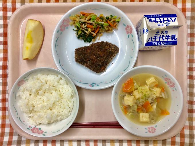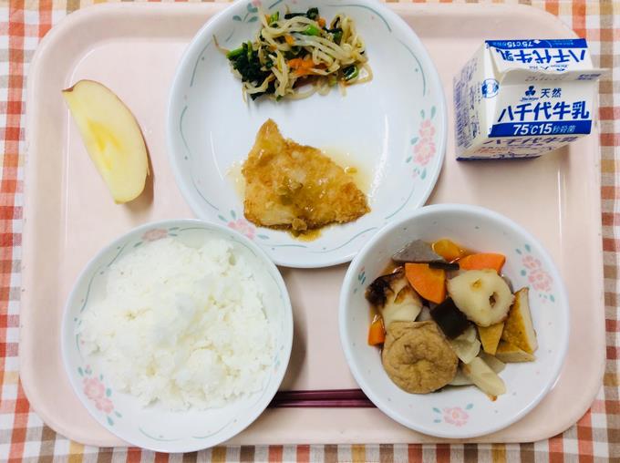 ご飯、鮫の竜田揚げ、おかか和え、根菜ごまみそ汁、りんご