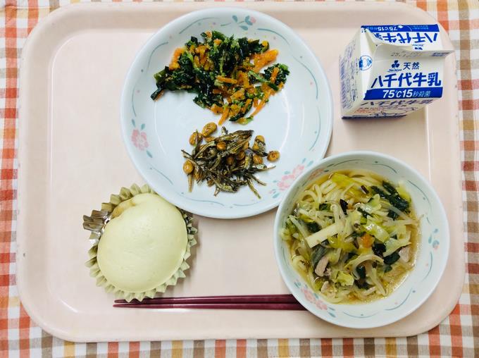 ちゃんぽん麺、肉まん、いりこ大豆、ごまみそ和え