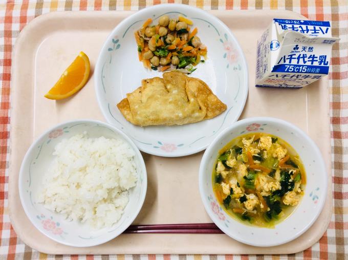 麦ご飯、*ハッピーピースチャオズ、ひよこ豆のサラダ、卵キムチスープ、オレンジ