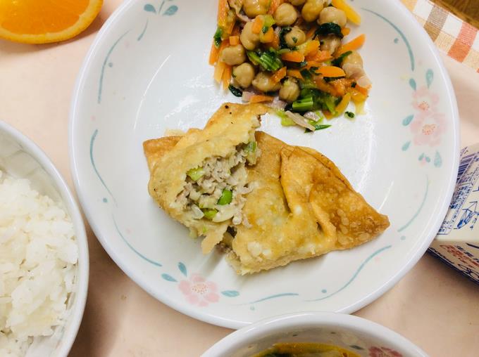 *ハッピーピースチャオズは、給食委員会考案メニューです。揚げぎょうざの具にグリンピースを入れました。