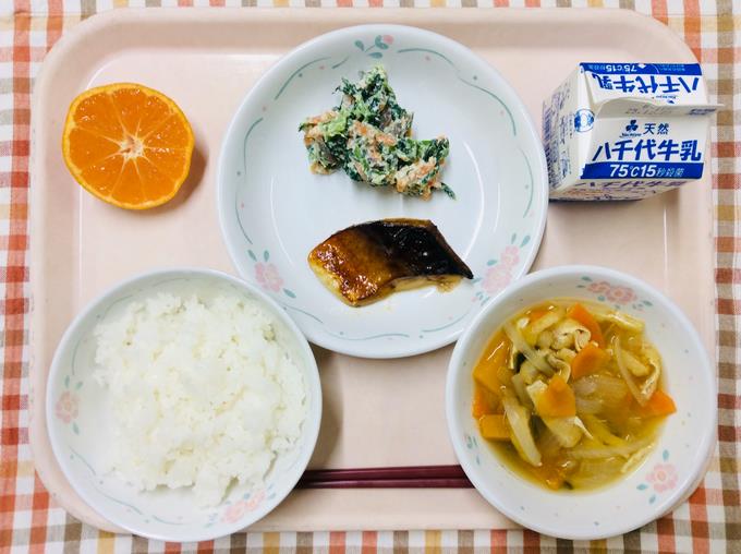 ご飯、鯖のゆずみそ焼き、白和え、かぼちゃのみそ汁、みかん