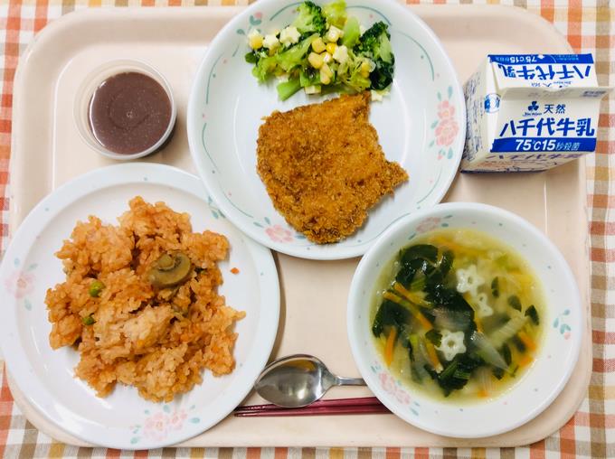 ケチャップライス、クリスピーチキン、ブロッコリーサラダ、星空スープ、ココアプリン
