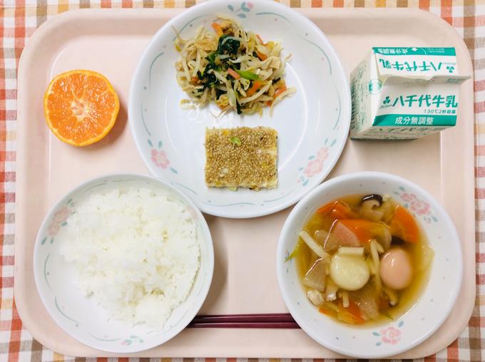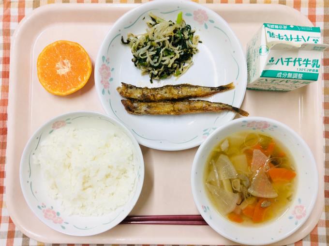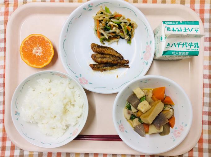 ご飯、小魚の揚げびたし、みぞれ和え、筑前煮、みかん