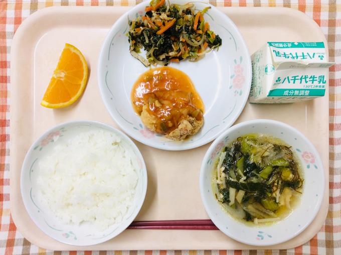 ご飯、鶏肉の甘酢あんかけ、五目炒め、もずくスープ、オレンジ