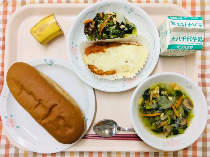 黒コッペパン、ラザニア、海藻サラダ、レンズ豆と野菜のスープ、バナナ