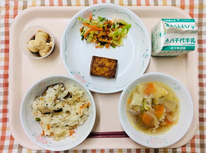 鶏ごぼうおこわ、生揚げの甘辛焼き、甘酢和え、せんべい汁、黒蜜きなこ白玉