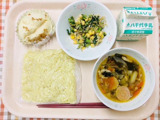 しょうゆラーメン、もやしとコーンのごま和え、甘酒蒸しパン