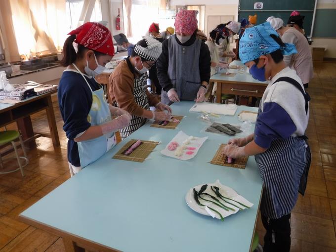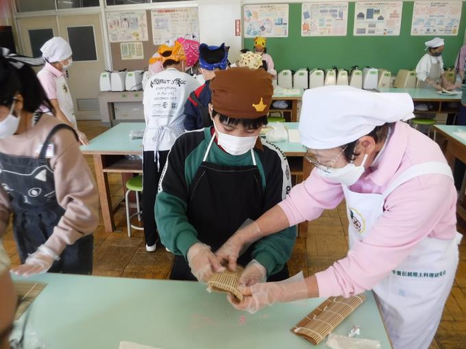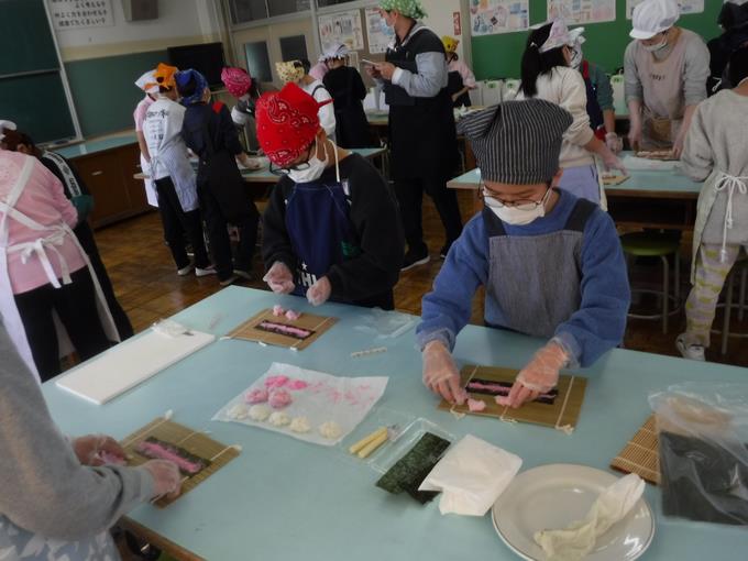 14日に5年生が、総合的な学習の時間に千葉県の郷土料理「太巻き祭り寿司」作りに挑戦しました。郷土料理研究会の方々をお招きし、千葉に伝わる食文化の知恵を学びました。
