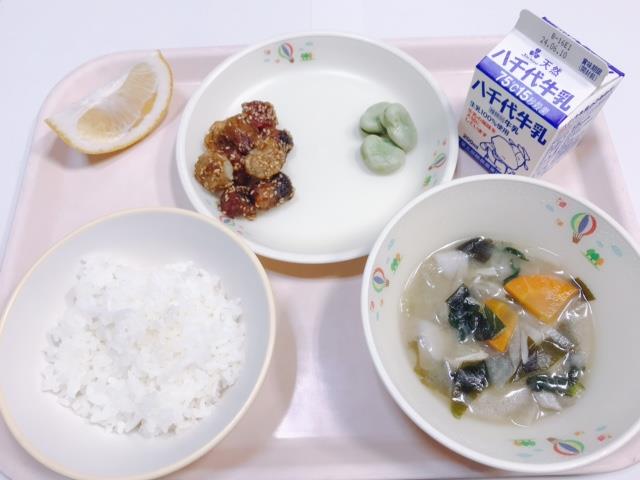 ☆今日の献立…ごはん、かつおとごぼうの香味ソース、茹でそらまめ、八宝みそ汁、河内晩柑、牛乳