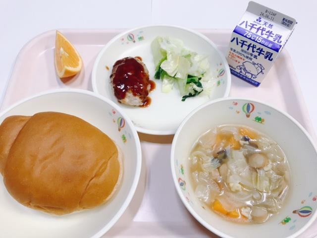 ☆今日の献立…セルフハンバーガー(テーブルロール・ハンバーグ)、フレンチサラダ、ABCスープ、オレンジ、牛乳