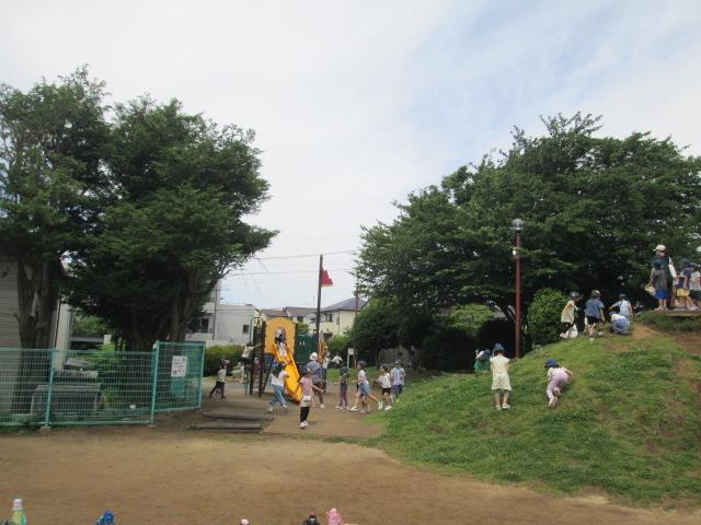 公園たんけんの様子です。公園への行きかえり、安全や学校に関する標識を見つけながら歩きました。公園に防災倉庫があることや、学校が避難所になっていることを知りました。公園での遊び方も再確認しました。交通安全に気を付けて、並んで歩くことができていて、すばらしいと思いました。