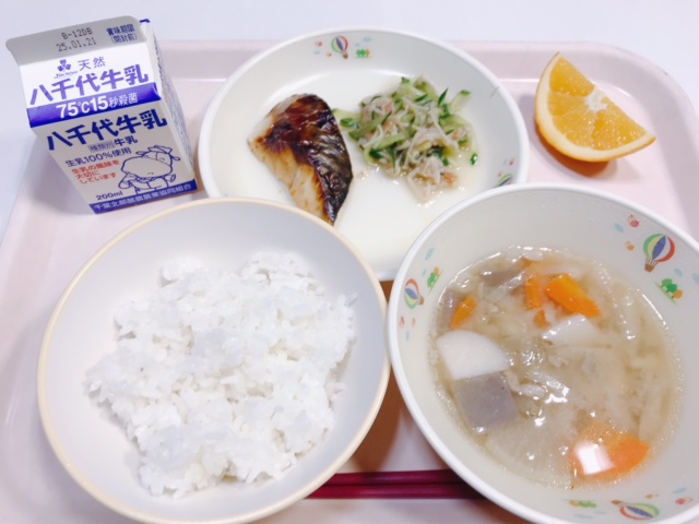 ☆今日の献立…ごはん、さばの塩こうじ焼き、きゅうりの梅おかか和え、豚汁、オレンジ、牛乳