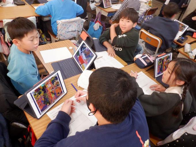 4年生の図工では、アンドレ・ドランの作品「リウに架かる橋」を題材に、色の使い方について話し合いました。 「明るいところは春を表している」「暗いところは冬を表している」など、一つの絵画から多様な読み取りができ、子どもたちの感性の豊かさが感じられました。さらに、タブレットを使って自分の考えを友達にわかりやすく説明する姿も見られました。ロイロノートへのアップロードなどもスムーズで、日頃からICTを活用している様子がうかがえました。