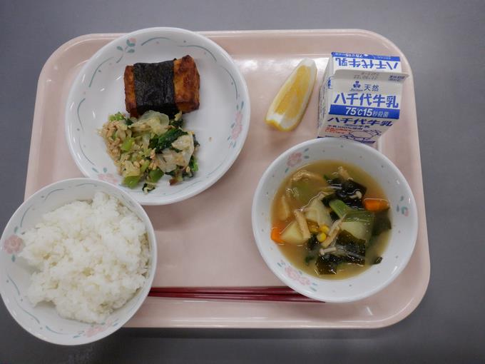 ご飯、さんまの蒲焼き風、辛子和え、根菜ごま汁、パインアップル、牛乳