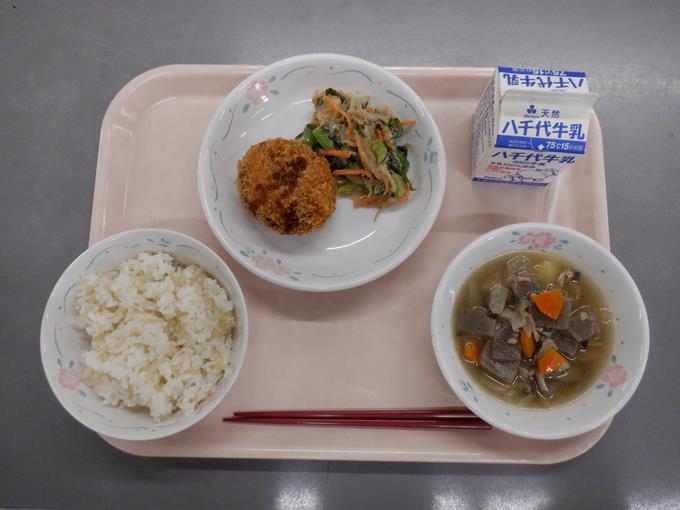 もち玄米ごはん、おからコロッケ、ごまみそ和え、のっぺい汁、牛乳