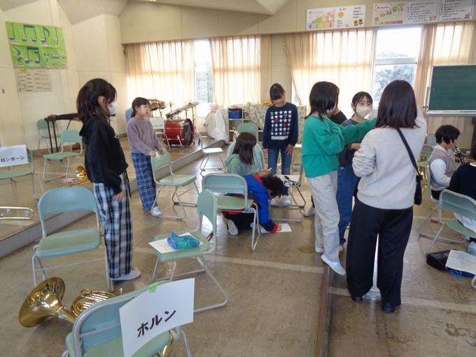 今日の放課後、来年度から入部を希望している児童に向けて、音楽部が部活動体験を開催しました。体験に参加した児童に、音楽部の児童が丁寧に楽器演奏を教えていました。