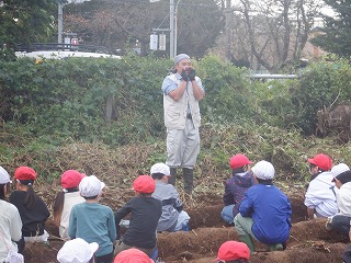 畑に移動し、お手伝いにきていただいた保護者の方々と挨拶をしました。また、畑の管理をしていただいた勝見さんと鈴木さんにサツマイモの堀方を教わり、かけ声を合図に始まりました。