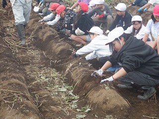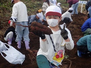 畑を変えたこともあり、サツマイモのサイズに不安もありましたが、いざ掘ってみると大きなサツマイモがたくさん出てきて子供たちも大喜びでした。畑の場所によって大きさに多少の差違はありましたが、全員自分が選んだサツマイモを持って帰ることができました。中には手で持つもの大変なくらいの大きなサツマイモを掘った子が何人もいて、うれしさや驚きで素敵な笑顔がたくさんありました。
