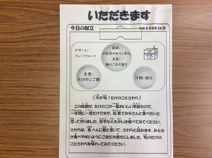 たけのこご飯🍚、さわらの🐟ごまだれ焼き、小松菜のおろし和え、豚汁🐷、グレープフルーツ🍊、牛乳🥛です。★今が旬!筍と鰆を味わいます。