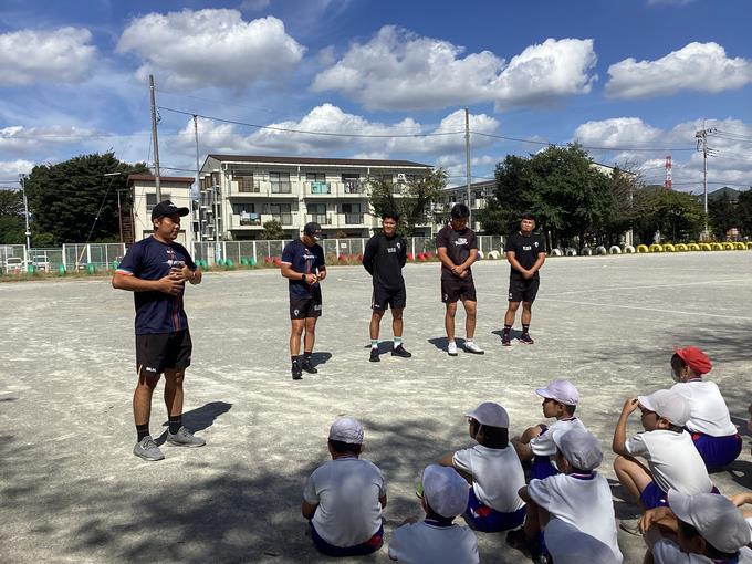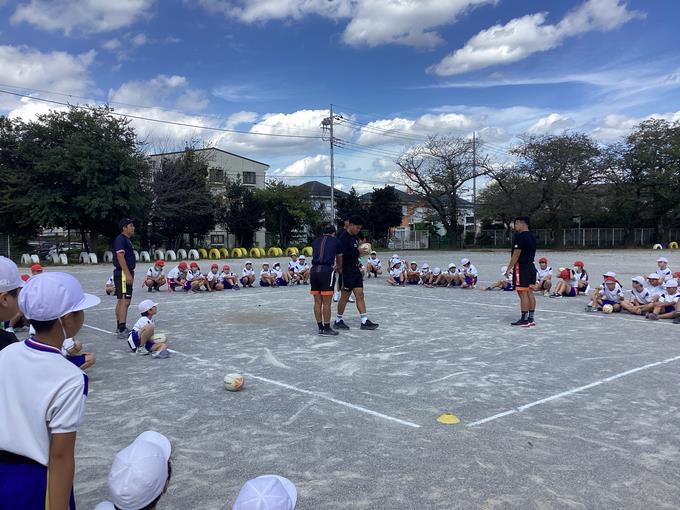 24日(水曜日)に、5年生はプロラグビーチーム「クボタスピアーズ船橋・東京ベイ」の選手とコーチの方々にお越しいただき、出前授業として、タグラグビーを教えていただきました。