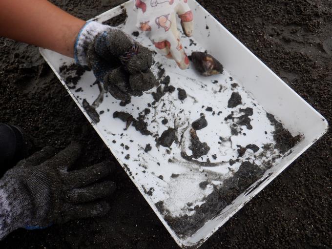 生き物を逃がすときには、カニが砂にもぐっていく様子に驚いていました。