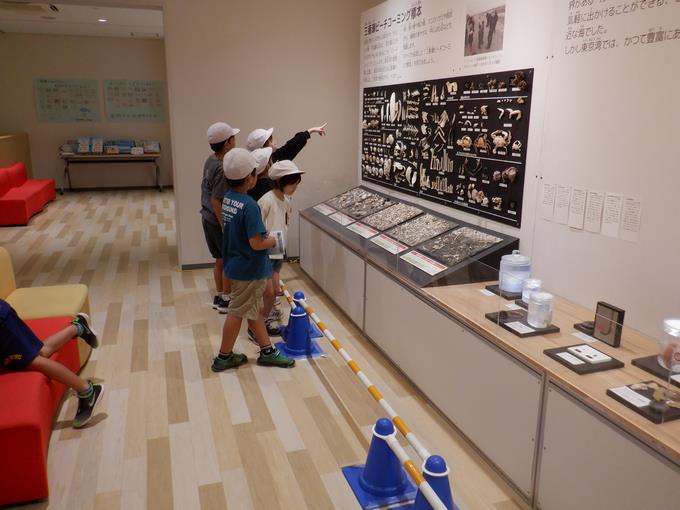 干潟での活動の後は館内で「さわれる地球」や展示を見て学習をしました。干潟でつかまえた生き物の標本や骨のパズルなどに興味を持っていました。