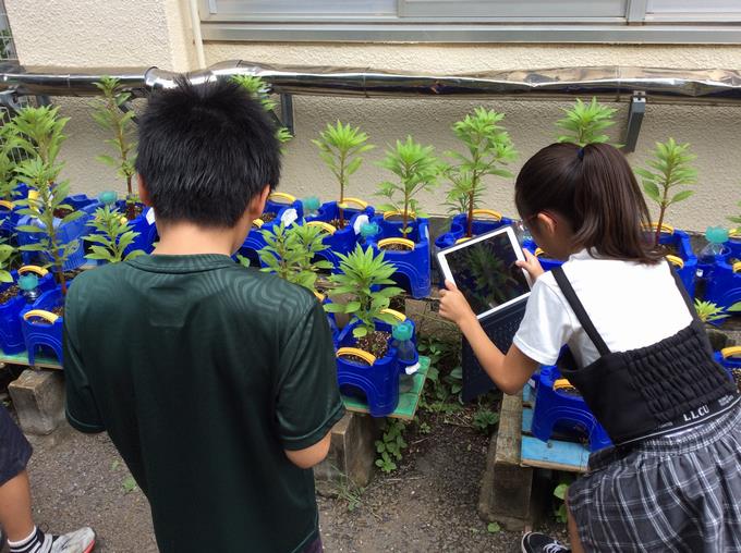 3年生がタブレット片手にほうせんかの観察をしていました。