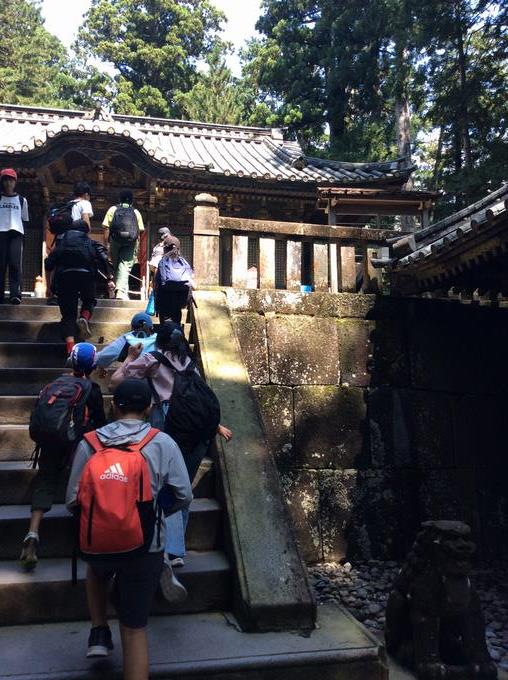 6年生の子供たちが待ちに待った修学旅行です。この日のために、夏休み前から事前学習を重ねてきました。いつもより早い登校時刻でしたが、みんなしっかり守ることができました。バスに乗って日光に向かいました。バスの中では、各クラスともレクを行い、楽しく向かいました。大きな渋滞もなく日光東照宮に到着。ここでは、グループ活動をしましたが、奥社までの長い階段に体力を使い、バテ気味の子もいました。