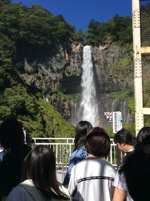 修学旅行2日目。起床は6時でしたが、夜なかなか眠れなかった部屋もあったようで、時間に気づかずに眠ったままで、先生たちに起こされていた部屋もありました。2日目、最初の見学先は「華厳の滝」です。エレベーターに乗って、約100メートル下の観瀑台に向かいました。トンネルを抜けると、大きな音とともに水しぶきをあげながら水が落ちてくる華厳の滝。その迫力に驚いている子も多かったです。