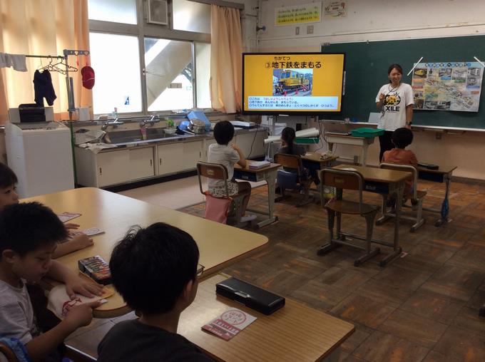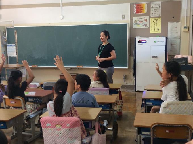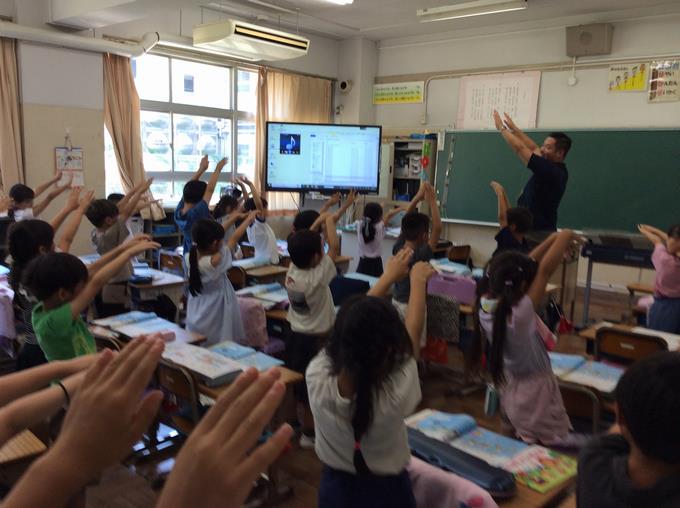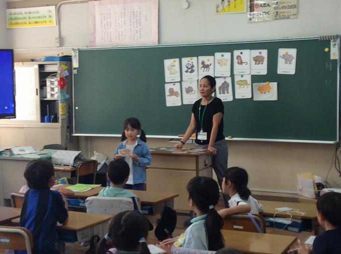 船橋市では、1・2年生から外国語の学習を行っています。週に20分の短い時間ですが、ゲームや歌を通して外国語(英語)に親しんでいます。時間によっては、1時間に2クラスの授業が入っているため、ALTの先生は大急ぎで教室を移動します。