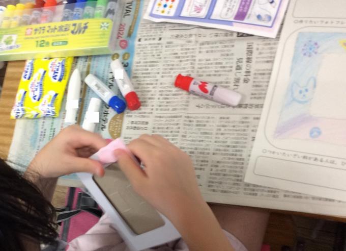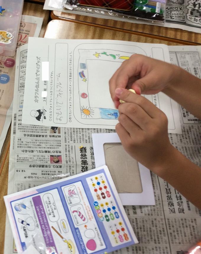 3年生が図工の時間にフォトフレームづくりをしていました。フレームの周りに、紙粘土を使って飾りをつけていく学習です。紙粘土は、絵の具を混ぜることで自分の好きな色の「色紙粘土」の変身します。教室をめぐっていた時に、ちょうどその色粘土を作っていました。黒の絵の具を混ぜ、紙粘土に練りこんでいる子たちは指先が真っ黒になっていました。色粘土が完成し、飾りになる立体を作っていたり、出来上がった色の粘土を台紙に張り付けている子もいました。事前に描いた設計図を元に制作していました。出来上がりも楽しみですが、写真を入れて飾ることも楽しみですね!