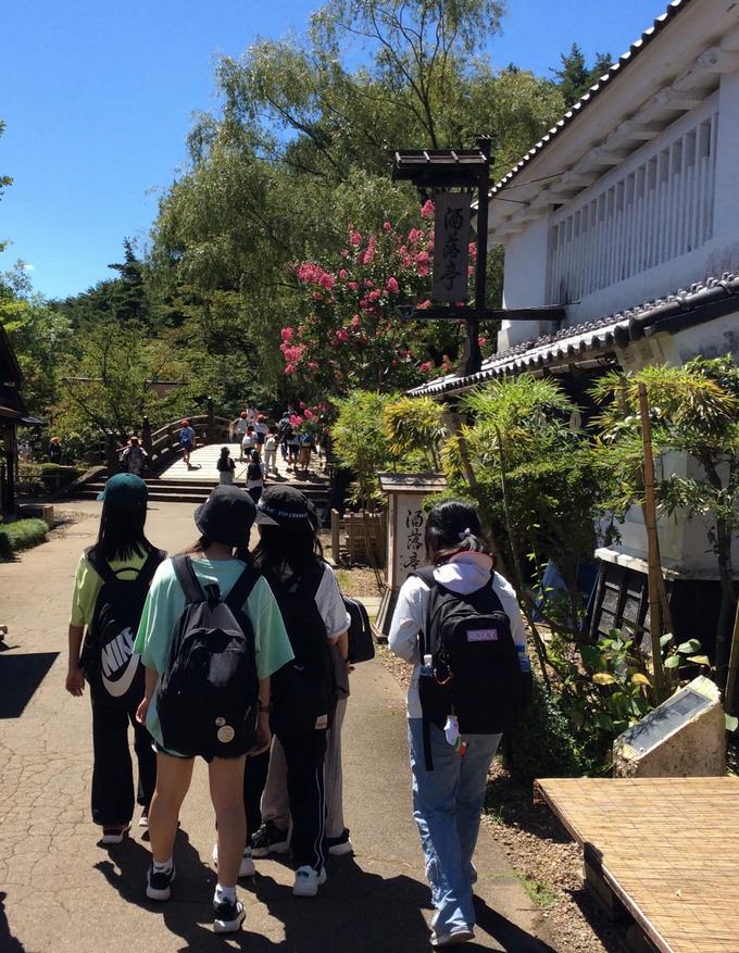 華厳の滝で大自然に触れたあとには、いろは坂を下りて、日光江戸村へ。グループ写真を撮ったあとには、お目当ての施設に張り切って向かっていました。