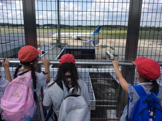 4年生は校外学習で成田空港と航空博物館に出かけました。まず、成田空港の大きさに子供たちはとても驚いていました。空港の職員の方に、空港にある施設や旅客便と貨物便の違いなどを教えていただきました。また実際に使用しているチェックインカウンターも見せていただき、その働きを説明していただきました。成田空港では、テレビ番組の撮影もよく行われているそうで、その場所を案内してもらいました。たまたま通りかかったときに、撮影をしていたので、子供たちのボルテージも上がっていました。展望デッキでは、実際に飛行機が飛び立つ場面を見ました。速さや音などその迫力を感じていました。