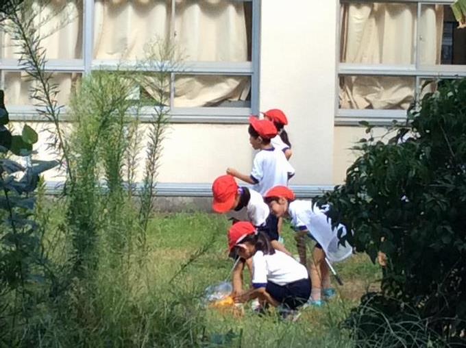 1年生が生活科の時間、虫取り網を持って、昇降口に集合していました。学校内の草むらにいる虫探しをするとのことでみんな張り切ってきました。