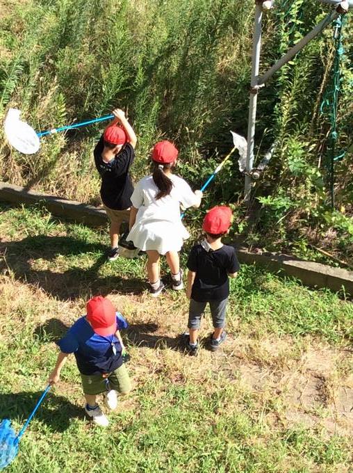 草むらをじっくりながめてチャンスを狙っている子や虫取り網で草むらの中をさぐっている子など、いろいろな方法で虫を捕ろうとしていました。