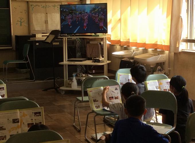 動画を見た後には、「太鼓を使っていた」「笠を持っていた」「掛け声があったよ」など様々なことを発表していました。普段の生活の中で伝統的な音楽に触れられる時間はあまりないので、今日はとてもよい機会になったと思います。ちなみに4年生、これから行われる運動会ではソーラン節を踊るそうです。