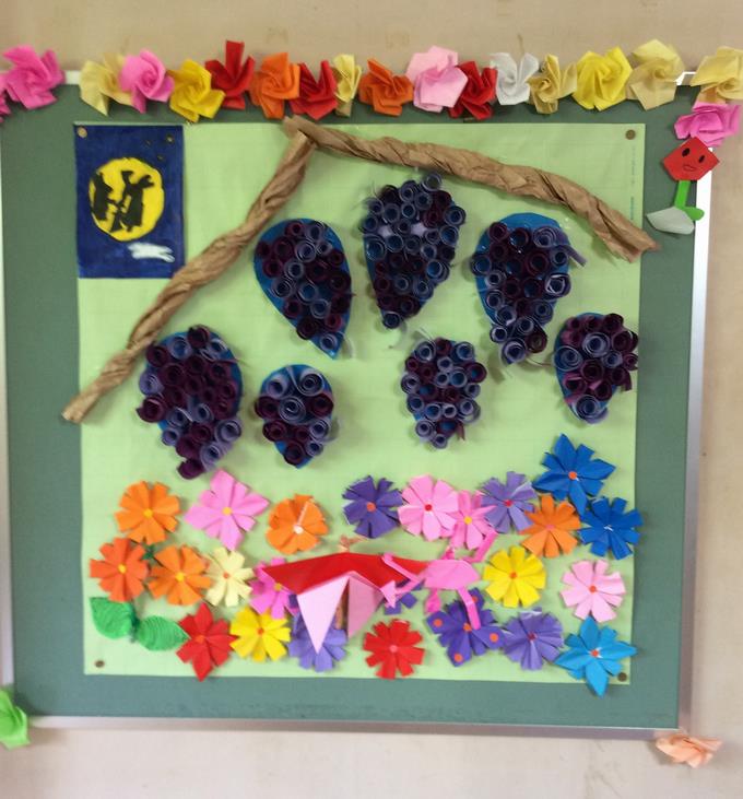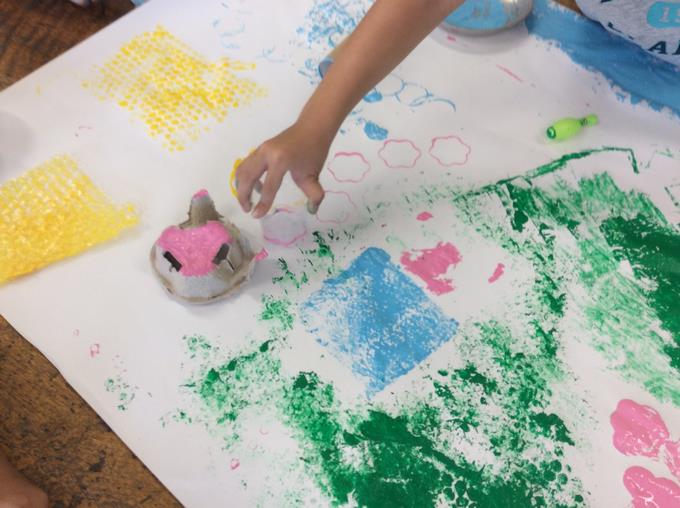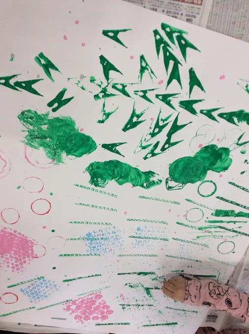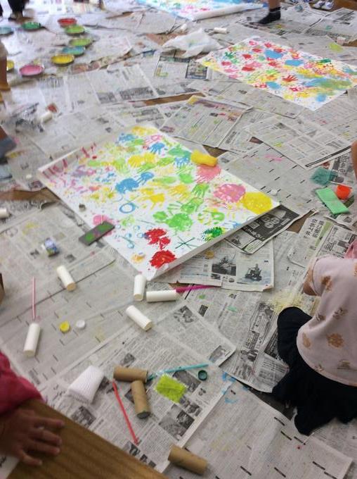 図工室から楽しそうな声が聞こえてきたので覗くと、1年生が図工の学習を行っていました。今日の学習は、スタンプぺったんです。友達といっしょにいろいろなスタンプを使い、形を写す活動をたのしみながら、表された形や色を見て、組み合わせ方を工夫したり、自分のイメージをもってみたりして、つくりだす喜びを味わい、スタンプをする学習活動にたのしく取り組むことをねらいとした学習です。子供たちは自宅から持ってきた材料を使って、大きな模造紙にぺったんする活動を楽しみました。3組さんは、教室一面に新聞紙を敷いて、学習に臨みました。夢中になって手に絵の具がいっぱいついている子供たちが多かったです。できあがった作品は廊下に掲示しました。迫力のある作品が完成しました。