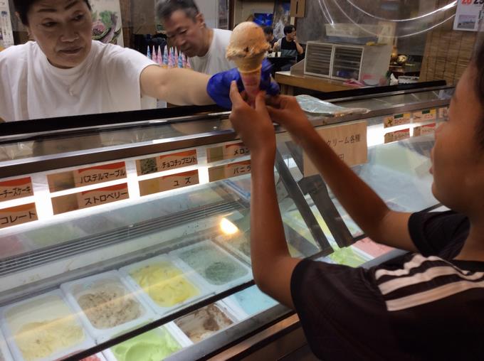 華厳の滝の見学を終えバスに乗車すると、ポツポツと雨が降り出してきました。戦場ヶ原に向かう途中バケツをひっくり返したような大雨となってしまったため、ハイキングは中止し、おやつのアイスクリームを食べに一路湯滝へ。湯滝に着くと雨は降っておらず、ここでは2グループから3グループで記念撮影をし、アイスクリームを食べました。種類が何種類もあって迷っている子は、周りにリサーチをして選んでいました。