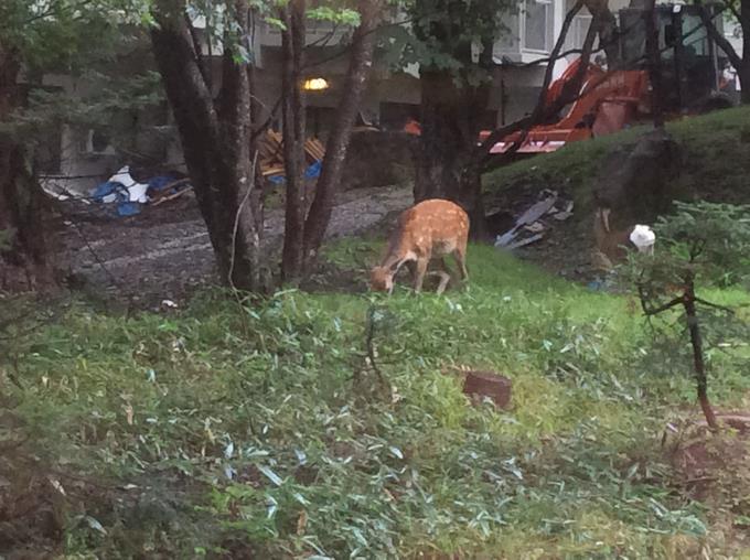 前日もそうだったのですが、朝食もお味噌汁とご飯のおかわりをする子がとても多かったです。途中で「あ!鹿!!」の声、ホテルの敷地内に鹿の親子が草を食みにやってきていました。野生動物を間近で見られた子たちは、大興奮でした。